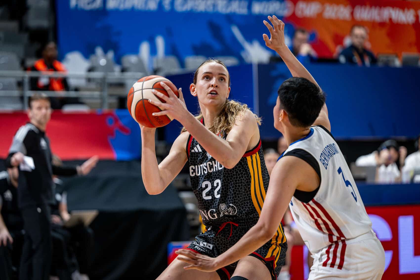 Die DBB-Damen sind mit einem Sieg in das Women’s Basketball World Cup 2026 Qualifying Tournament gestartet. Das Team von Bundestrainer Olaf Lange setzte sich heute in Lyon/FRA gegen Südkorea mit 76:49 (23:12, 17:8, 11:18, 25:11) durch. Schon morgen geht es um 17.00 Uhr mit der Partie gegen die Philippinen weiter (ab 16.45 Uhr live und kostenlos bei MagentaSport). Bühner stark Deutschland begann mit Alexis Peterson, Leonie Fiebich, Alina Hartmann, Frieda Bühner und Nyara Sabally. Lange hatte vor dem Spiel eindringlich auf die Schnelligkeit und Wurfstärke der Koreanerinnen hingewiesen. Und Korea stellte seinen „Ruf“ mit zwei frühen Dreiern unter Beweis, gekontert von guter deutscher Offensive (9:8, 3.). Peterson bestimmte das Tempo, Korea netzte seinen dritten Dreier (11:11, 5.). Dann griff Deutschlands Defense einige Male sehr gut zu und Bühner besorgte die 15:11-Führung (6., Auszeit Korea). Die starke Bühner war es auch, die per Dreier auf 18:11 stellte (8.), man hatte den Gegner in diesen Minuten gut im Griff. Sabally dominierte an den Brettern und nach dem ersten Viertel war ein erstes Ausrufezeichen gesetzt (23:12). Dominanz Nach den anfänglichen Problemen hatte sich die deutsche Defenese hervorragend auf den Gegner eingestimmt. Man dominierte die Rebounds ganz eindeutig und nur gelegentliche Unkonzentriertheiten machten den Gegner stark (25:15, 12.). Sabally traf von weit draußen zum 29:17 (13.), aber Südkorea hatte nach längerer Zeit mal wieder eine passende Antwort. Deutschland kontrollierte das Spiel in weiten Teilen und baute duch Emma Eichmeyer auf 35:20 aus (16.). Bühner war kaum zu stoppen und näherte sich bereits einem double double. Fiebich erzielte das 40:20, bei Südkorea war jeglicher Rhythmus gestoppt. Zum Seitenwechsel war vermeintlich bereits eine Vorentscheidung gefallen. Boxscore Fotos: DBB/Camera 4 | FIBA Alle Infos zur WM-Qualifikation Fünf Minuten punktlos Nun galt es konzentriert zu bleiben und den Gegner nicht wieder in die Partie zu lassen. Der bessere Start gelang aber den Koreanerinnen (40:26, 24.), während das DBB-Team wohl noch in der Kabine war. Fast fünf Minuten waren vergangene ehe Deutschland durch Bühner wieder aufs Scoreboard kam. Südkorea war plötzlich wieder im Spiel (44:32, 26.). Deutschland berappelte sich und schaffte einige Stopps, aber die Koreanerinnen hatten jetzt wieder eine ganz andere Körpersprache als im zweiten Viertel. Fiebichs Dreier zum 51:35 tat sehr gut (29.), doch der Flow kam im dritten Spielabschnitt nicht mehr zurück (51:38). Letztlich ungefährdet Bühner eröffnete das Schlussviertel mit einem Dreier und gab Sicherheit. Doch insgesamt waren jetzt einfach zu viele Fehler im deutschen Spiel, Lange bat seine Spielerinnen zu einer Auszeit (56:42, 33.). Ein ganz weiter Dreier von Alex Wilke fand sein Ziel zum 59:42 und nach Saballys 61:42 glaubt niemand mehr an ein Comeback Südkoreas (34.). Nach einem getroffenen Freiwurf der Südkoreanerinnen erhöht Peterson aus der Distanz auf 66:43 (36.). Das Spiel ist weiterhin geprägt von Turnovers, bis Fiebich einen Angriff von Außen trifft und Eichmeyer kurz danach auf 71:47 stellt (38.). In den letzten Minuten gibt es noch ein Debüt. Nina Rosemeyer steht zum ersten Mal für die deutschen Damen auf dem Court. Nach drei getroffenen Freiwürfen von Bühner schließt Daub im Fastbreak mit zwei Punkten ab. Deutschland siegt souverän mit 76:49. „Es macht Spaß!“ Leonie Fiebich: „Ich bin glücklich, dass wir gewonnen haben. Ich bin sehr stolz aufs Team, dass wir uns nicht aus der Ruhe bringen lassen haben. Gegen asiatische Team zu spielen ist immer schwer, weil so viel Schnelligkeit da ist. Es macht Spaß mit diesem Team zusammen auf dem Feld zu stehen.“ Olaf Lange: „Ich bin froh, wie wir gespielt haben, mit viel Herz. Wir haben in der ersten Halbzeit sehr dominiert, vor allem mit Rebounds. Im dritten Viertel kam dann kurz die harte Phase, aber auch das haben wir regeln können. Unsere Schlüsselspielerinnen haben sehr gut gespielt, aber auch von der Bank wurden wir gut unterstützt.“ Name Punkte Verein Alexis Peterson 9 ESB Villeneuve d’Ascq/FRA Alexandra Wilke 5 Rutronik Stars Keltern Jennifer Crowder 0 Herner TC Nyara Sabally 11 New York Liberty/WNBA Leonie Fiebich 16 Valencia/ESP|New York Liberty/WNBA Emma Eichmeyer 6 Saarlouis Royals Alina Hartmann 0 ALBA BERLIN Britta Daub 2 Eisvögel USC Freiburg Frieda Bühner 21 Movistar Estudiantes Madrid/ESP Emily Bessoir 6 Lointek Gernika Bizkaia/ESP Nina Rosemeyer 0 ALBA BERLIN Patricia Broßmann dnp ASD Basket Costa Masnaga/ITA