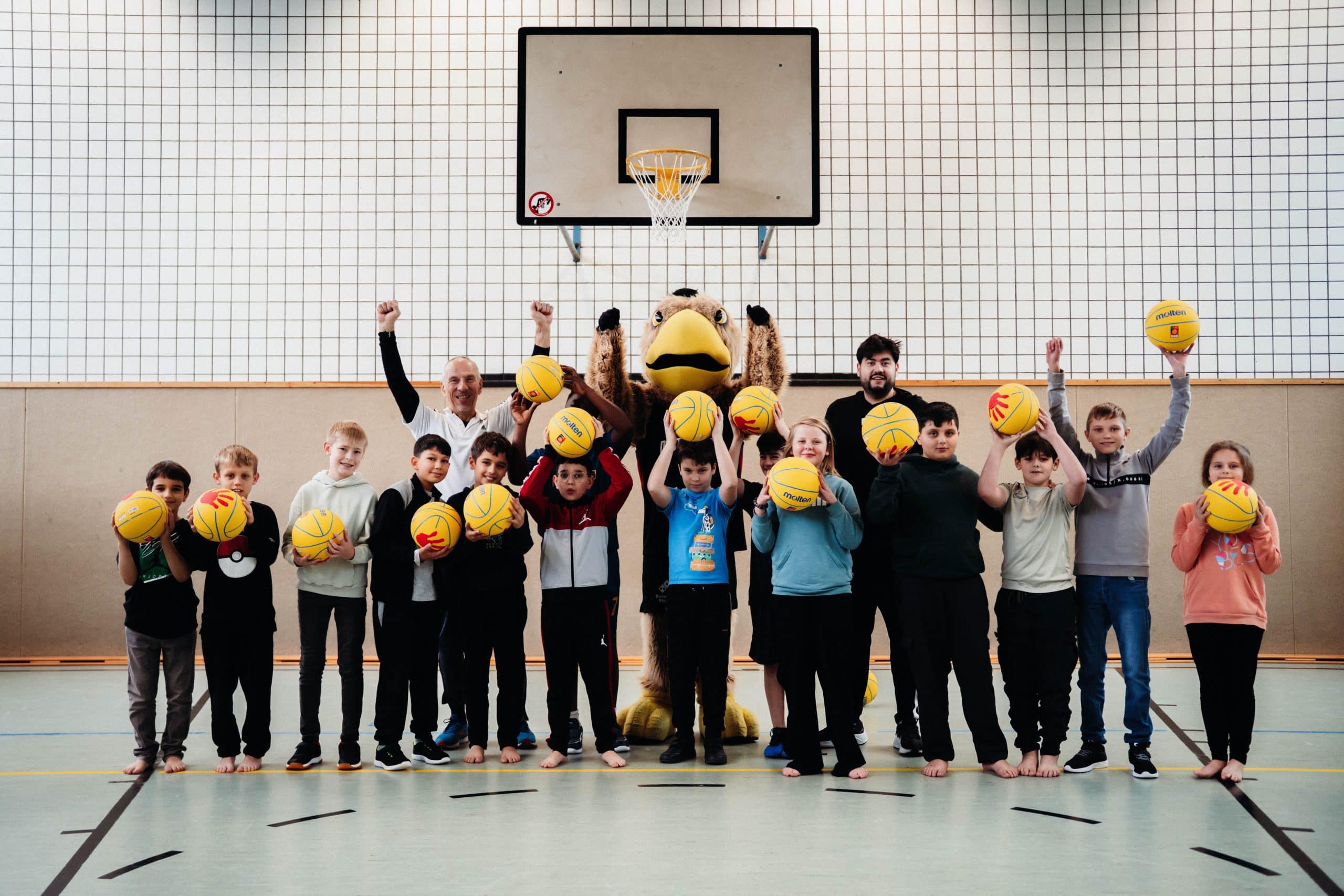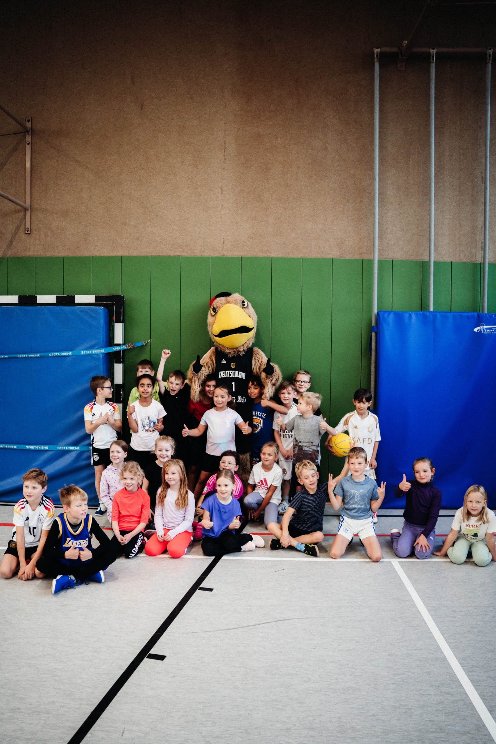 Am vierten Tage der Grundschulwoche 2025 ging es für DBB-Maskottchen Arnold wieder in die Nähe seines Heimatortes Hagen. Zu Besuch war er diesmal an der Antoniusschule in Klein Reken, einer kleinen Gemeinde in NRW. Dort ging es in der Früh gleich mit großer Energie in den Stationsparcours der Schule, begleitet von engagierten Lehrkräften, die den Aktionstag auch musikalisch begleiteten.