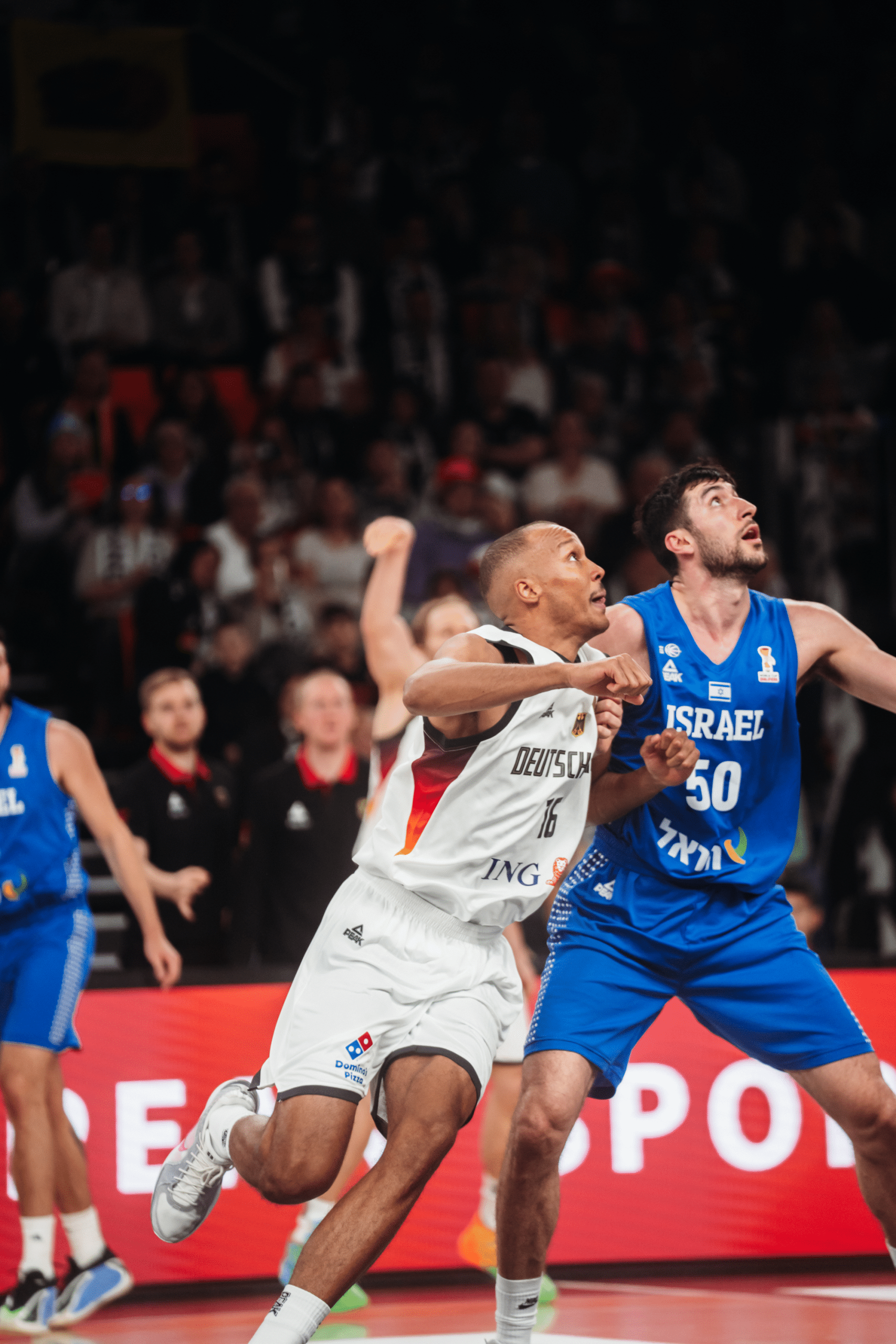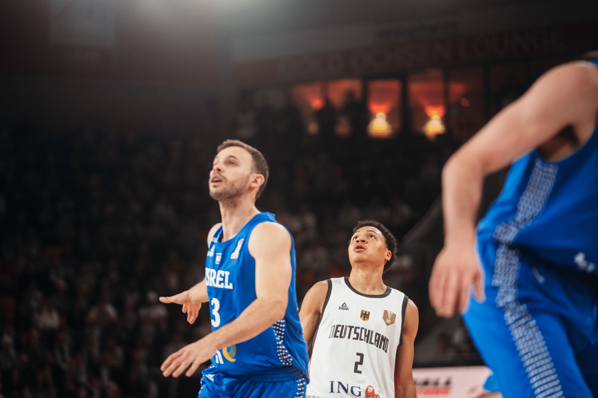 Vor Spielbeginn wurden Isaac Bonga und Justus Hollatz für ihr jeweils 50. L änderspiel geehrt. Die deutsche Startformation setzte sich heute aus Hollatz, Malte Delow, Bonga, David Krämer und Oscar Da Silva zusammen. Krämer konterte die ersten israelischen Punkte aus der Dreierdistanz, Da Silva traf zum 5:5 (2.), legte einen Dunking zur ersten deutschen Führung nach und besorgte auch das 9:5 (4.). Die DBB-Asuwahl bemühte sich um hohes Tempo, während es der Gegner eher „gemächlich“ angehen ließ. Da Silva war kaum zu stoppen und punktete zum 13:7, Auszeit Israel (5.). Jack Kayil checkte mit Punkten zum 15:7 ein, Deutschland war gut gestartet. Norris Agbakoko kam früh zu seinem Länderspieldebüt und trug sich an der Freiwurflinie sogleich in die Scorerliste ein (17:10, 6.). Carrington netzte zwei Dreier für Israel und kam besser ins Spiel, das DBB-Team verpasste einige offene Würfe (17:16, 8.), Auszeit Deutschland. Joshua Obiesie stoppte den Lauf des Gegners, aber Israel bestach jetzt aus der Ferndistanz. Mit der Schlusssirene des ersten Spielabschnitts traf Louis Olinde zum 26:22.